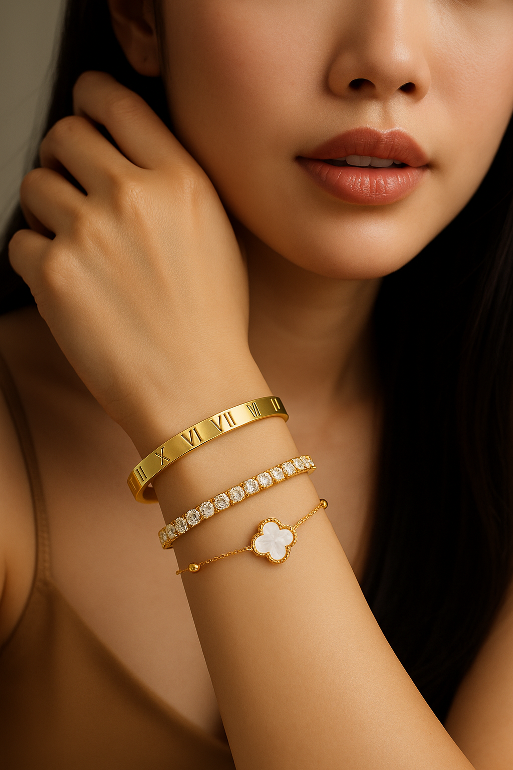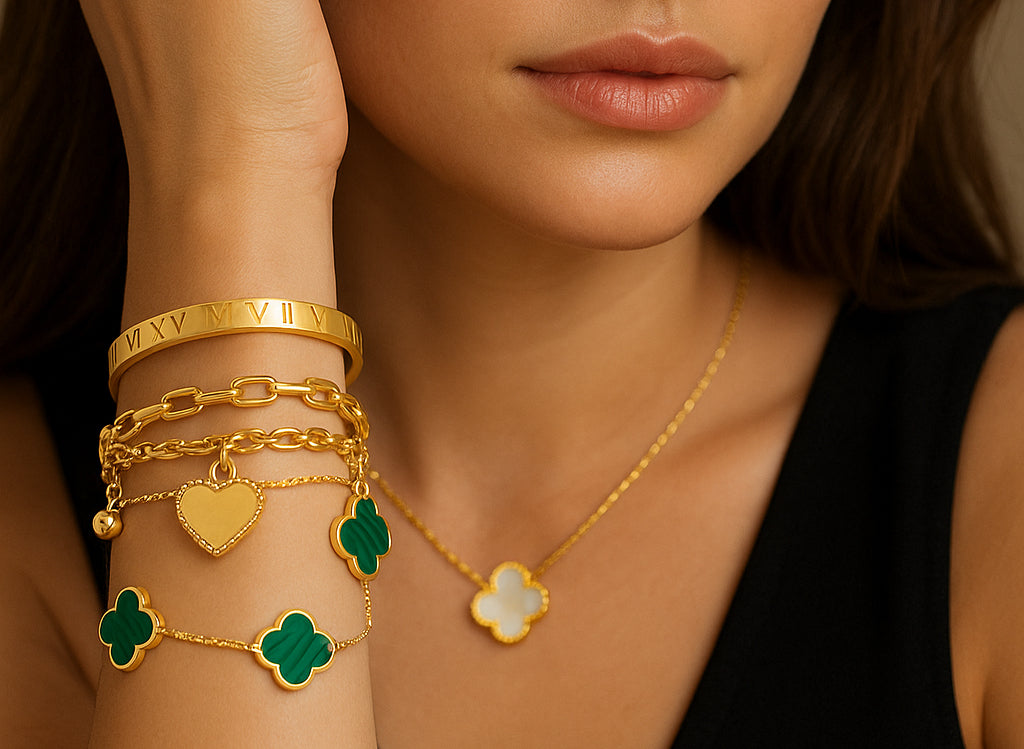 Discover Tisha Jewellery — where everyday elegance meets lasting quality.Our pieces are crafted with top-quality materials, featuring three-layers of 18K gold plating over stainless titanium steel for unmatched durability. Each design is waterproof, hypoallergenic, and safe for sensitive skin, so you can wear it confidently every day without tarnishing. Finished with brilliant cubic zirconia crystals, Tisha Jewellery brings detailed craftsmanship and timeless shine to your daily style.